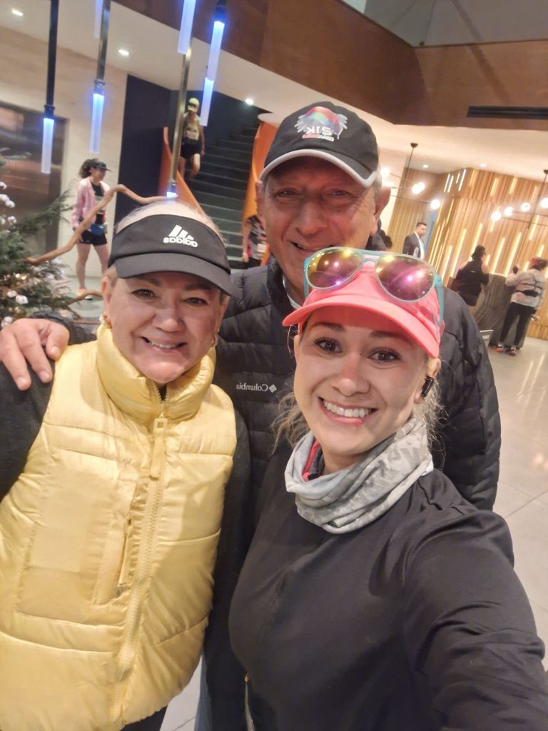 No me puedo quejar, fue una de las pocas noches que duermo antes de un maratón, sí me desperté como dos veces, pero descansé. Incluso soñé que se me hacía tarde y no llegaba al punto de salida, pero solo fue eso, un sueño (pesadillas para runners jaja). Me desperté antes de mi alarma, 4:00am y a empezar a desayunar hot cakes (los había pedido en la noche porque el hotel no tenía desayuno para runners, como en otros lados) y café, que me ayuda a darme energía y despertarme. Me arreglé, me puse la chamarrita, guantes y buff, seguía muy frío por la lluvia de la noche, mis papás me acompañaron al lobby para empezar a estirar y calentar antes de salir al punto de disparo, me dieron la bendición y nos abrazamos antes de irme.