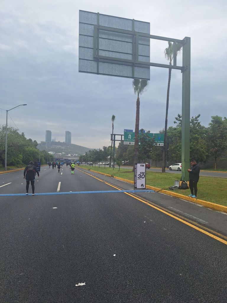 Cuando llegué al km 18, les dije a mis compañeros que me pararía a abrocharme los tenis, porque los sentía muy apretados, y cuando me agaché, mis piernas estaban durasss, no me gusta parar porque es más difícil volver a agarrar el ritmo, y luego con el frío en las piernas, peor.