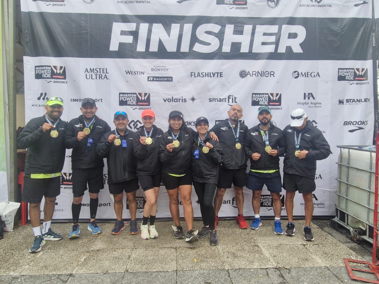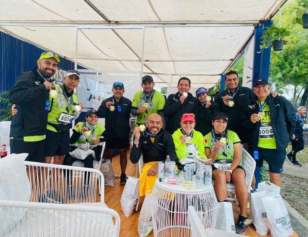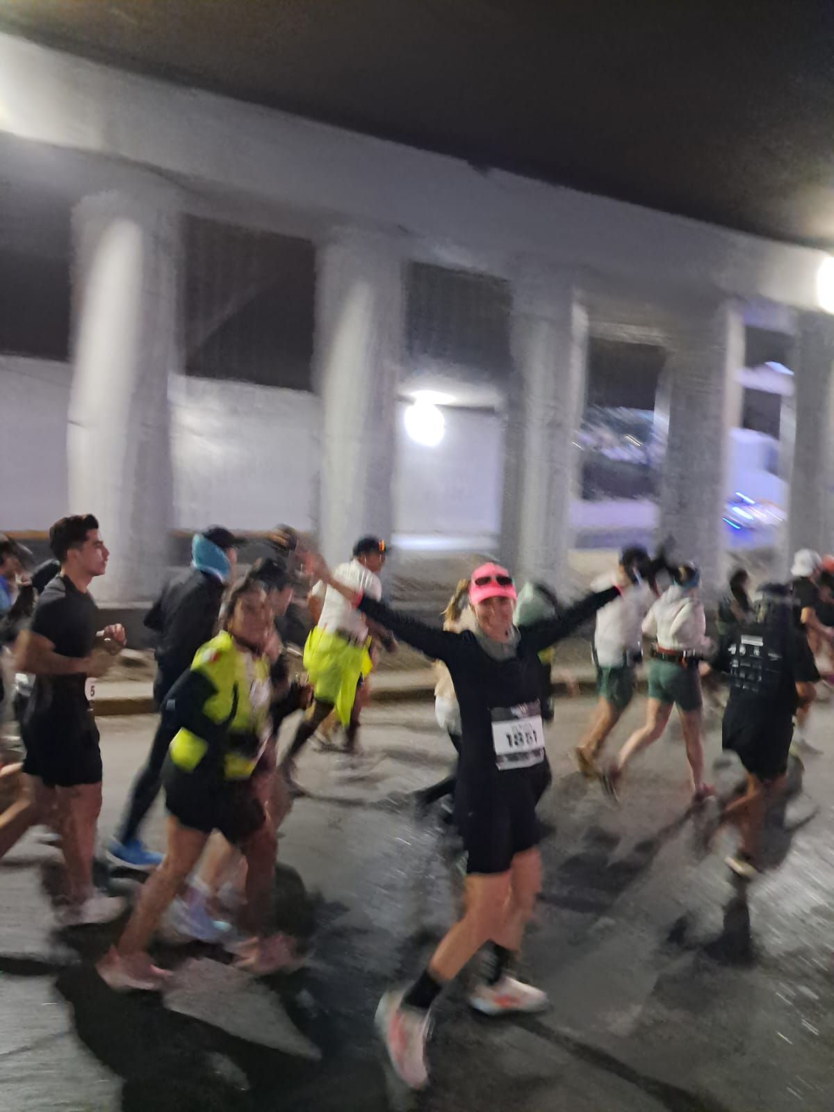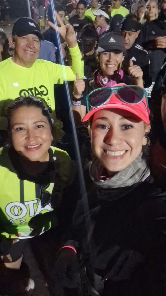 En el hotel habían varios runners hospedados, todos estábamos calentando y estirando, y junto con una de ellas, nos fuimos caminando y platicando hacia la salida del maratón. Yo me sentía muy tranquila. Eran unos 2kms más o menos de distancia del hotel hacia ese punto. Me sentí muy bien, confiada y muy animada. Nos juntamos mi club, nos tomamos fotos, nos dimos porras y muchos ánimos y quedamos de vernos en la meta.