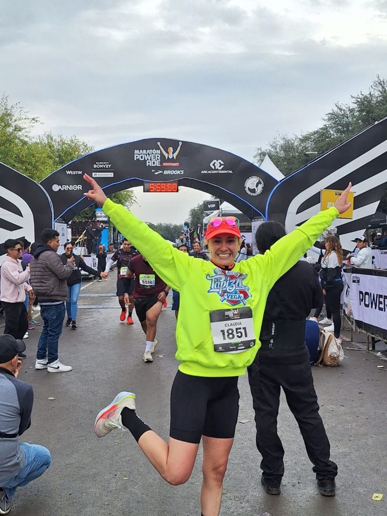 Nos vamos acercando al km 40 y yo bien equipada con sudadera fosfo fosfo calientita, y luego entras al Parque Fundidora y toda la gente echando porras, el último tramito, y se ve el km 41 grande, ya sólo falta un km más! Pero ahí era TANTA LA EMOCIÓN que empecé a llorar, y me paré a respirar y asimilar todo, seguí avanzando sola, porque Dianita se siguió y no pude alcanzarla, la gente gritándome, «vamos Claudia, tú puedes, ya casi llegas» de esas veces que ves pero al mismo tiempo no ves nada jaja, y solo oyes ruido, pero no entiendes nada, está todo en cámara lenta. Agarré mi cel, me puse a ver mensajes, les mande un video a mi familia, que ya estaba por terminar, que ya casi llegaba y puse la canción de «Viva la vida» de Coldplay, y pff, el himno para la llegada! Esa canción es LA CANCIÓN..